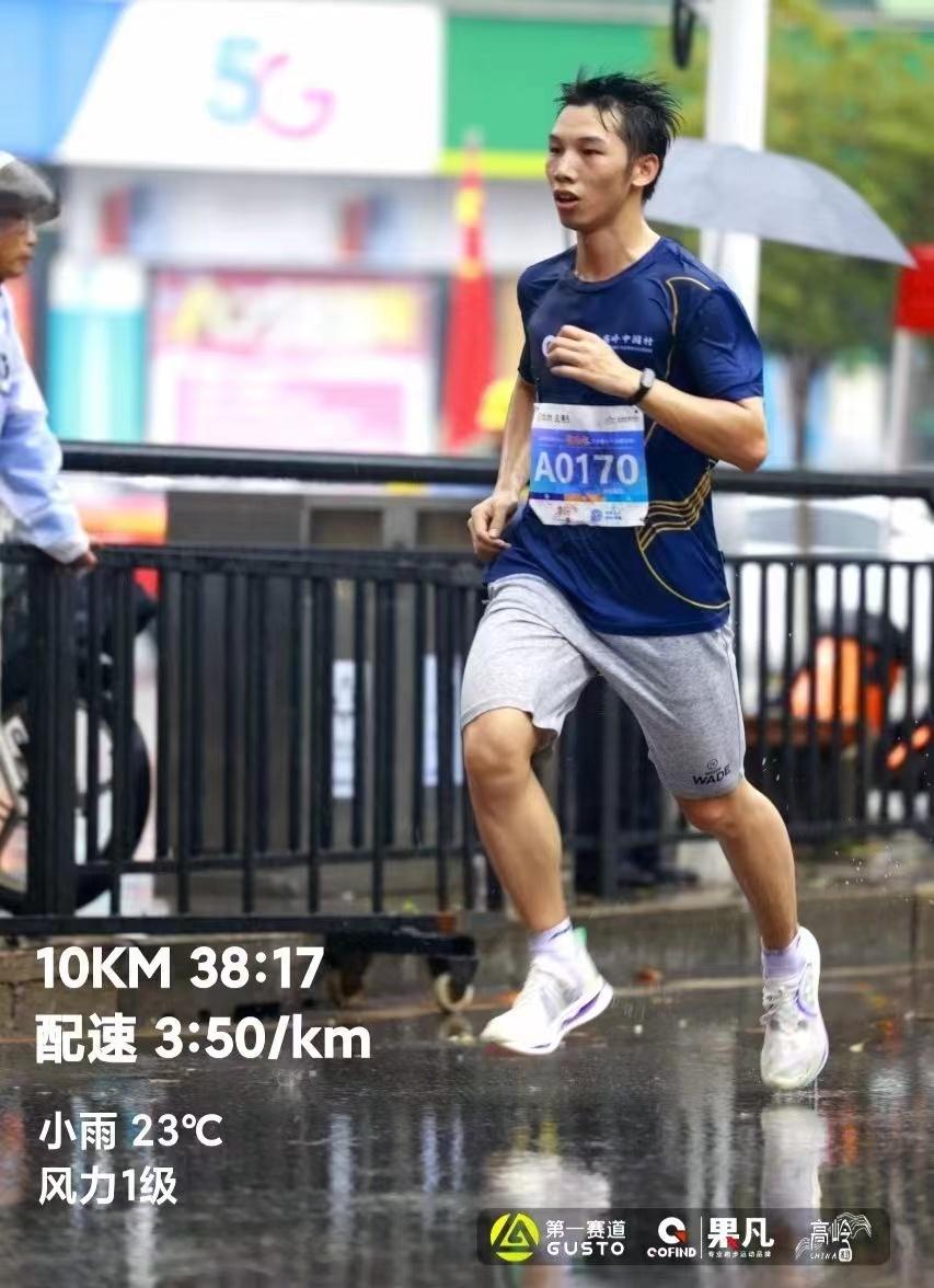 2021年的一个下午,我第一次跑完一个完整的10km。我至今都记得那时的心情,那种成就感,好像在平淡的生活里很久很久没有了。很多跑者都会谈跑步的初心,也许我的初心就是在那时才产生的:我想跑的更远、跑的更快,希望平凡普通的生活中,能保持着自己的自信与优点。那份成就感给予了我最初坚持跑步的动力。我给自己定下一些小目标让我保持清晰的方向与前进的动力。在大学,我参加了每一年的校运会,参加了2022年的省运会,通过比赛磨砺身体与意志,曾经的小目标在逐步实现。
