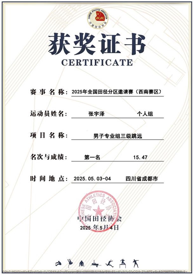 近日,由中国田径协会举办的全国田径分区邀请赛在四川成都举办,我校22级体育教育专业张宇泽同学,凭借出色发挥,在三级跳远项目中脱颖而出,以15米47的优异成绩斩获冠军,并成功获得田径一级运动员称号,实现了我校在田径项目中第一个全国冠军,也是第一个获得一级运动员称号的同学,双双实现历史性突破。