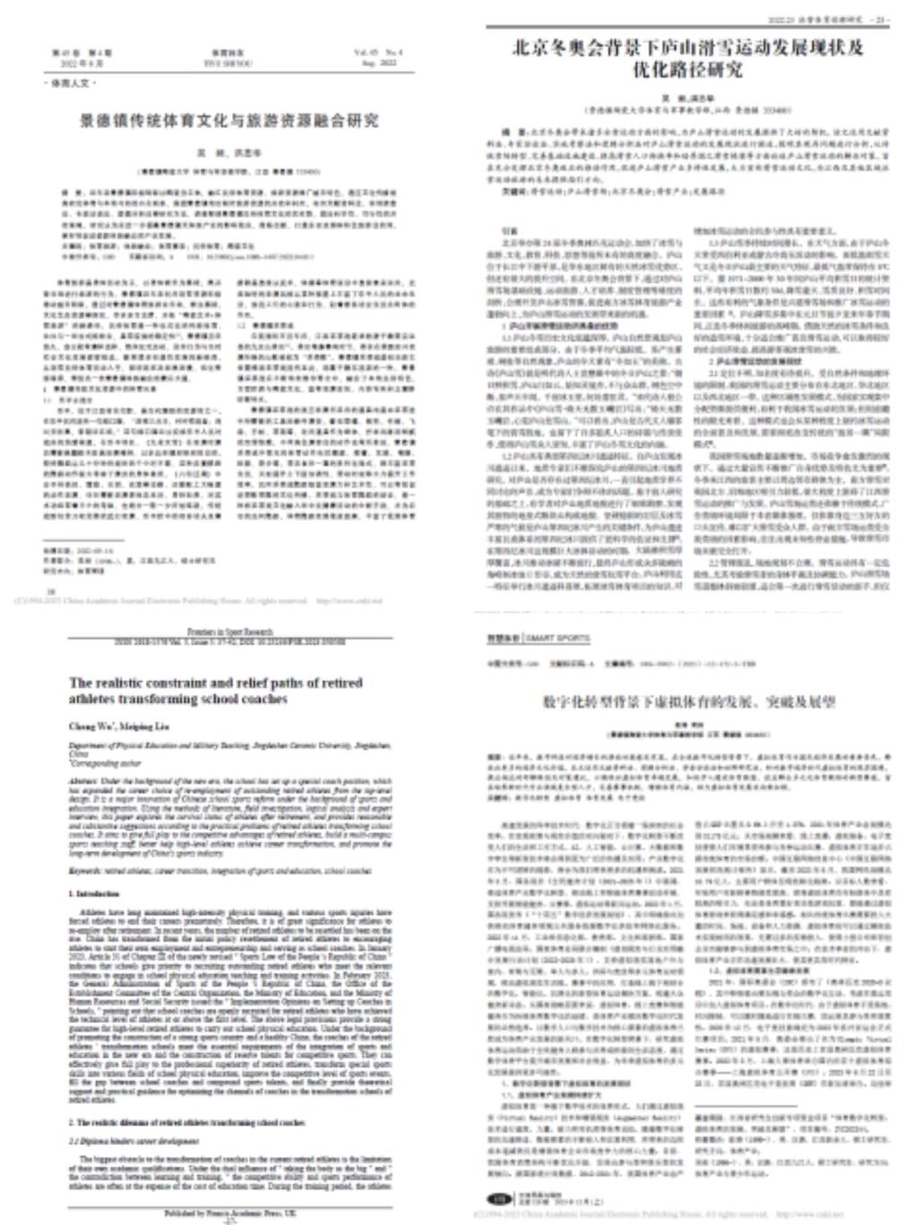 吴昶同学自2021年入学以来,学业成绩的平均绩点为3.97/4.0,8门专业课成绩在90分及以上,综合成绩位列专业第二名(共19名),曾获得市优秀志愿者(4次)、市优秀裁判员(2次)、校优秀学生干部(2次)、校优秀宣讲员(2次)等荣誉。通过整理和阅读大量的本专业相关书籍和中英文文献,以文化传播的视角研究景德镇当地习俗与体育的内在联系,促进千年瓷都体旅融合的产业发展。在北京冬奥会和杭州亚运会背景下,探索适合东亚青少年的运动方式,以景德镇陶瓷大学为第一单位,以本人为第一作者或第二作者的身份在《体育师友》《冰雪体育创新研究》《青少年体育》《Frontiers in Sport Research》《文体用品与科技》期刊上发表5篇论文,在投论文3篇。同时,他非常注重英语的学习与基本技能的提升,一次性顺利通过全国大学英语四级考试(CET-4:427分)、雅思考试(总分6.0分)、普通话水平二级甲等考试等。