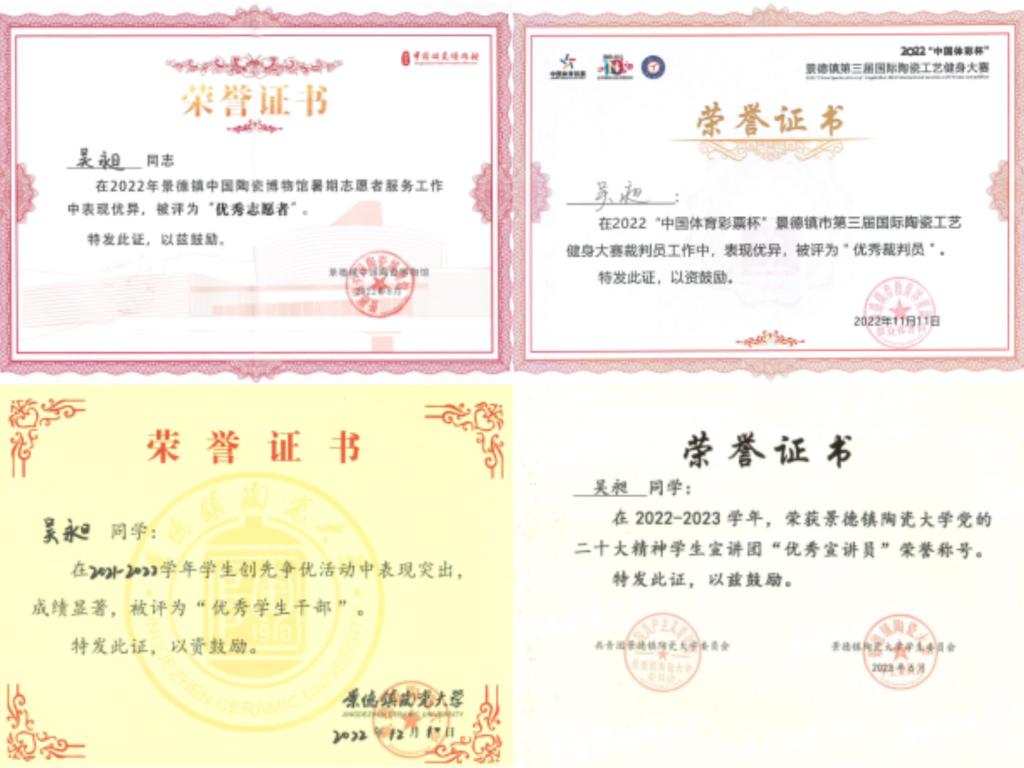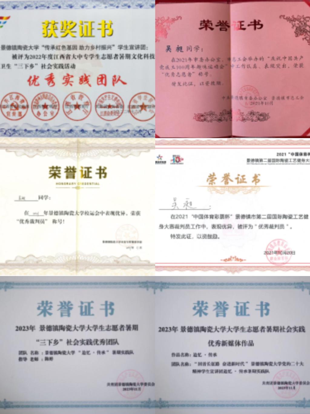 在社会实践方面,吴昶热衷于做志愿服务,2021年10月,作为赛事管理员的他,与景德镇市委、景德镇市总工会共同组织策划趣味运动会项目。2022年7月至8月,参与景德镇中国陶瓷博物馆的日常运营管理,协助博物馆为游客提供参观指引。连续两年参加全国三下乡暑期社会实践活动,前往实践地为当地驻村干部、村民及学生讲课、辅导,建设社会主义新农村。作为实践队伍负责人,带领团队荣获共青团中央2022年全国“三下乡”社会实践“优秀品牌项目”荣誉称号。研究生期间,共获得国家级、省级、市级荣誉20余项。
