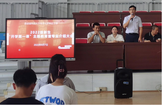 党委书记占松青以《爱党、爱国、爱校、荣校》为主题为全体新生开展入学教育。他简要回顾了学校以及体育与军事教学部的发展脉络与取得的成绩,并表示,期盼2022级全体同学以青春的名义大放光彩,立足专业学习和自身成长,以优异的成绩迎接党的二十大胜利召开。党委副书记、主任陈利和以《弘扬中国体育精神,担当民族复兴大任》为主题,向同学们开展了一堂生动的入学教育,他用2022年北京冬奥会和冬残奥会上运动员们拼搏的故事,告诉同学们:体育承载着国家强盛、民族振兴的梦想。而在座的新生们学习的正是体育教育专业,也是陶瓷大学唯一一个师范类专业,更应该要传承和弘扬“诚朴恕毅”的陶大精神,秉持“为国争光、无私奉献”的中国体育精神,努力在实现中华民族伟大复兴的中国梦的生动实践中放飞青春梦想!