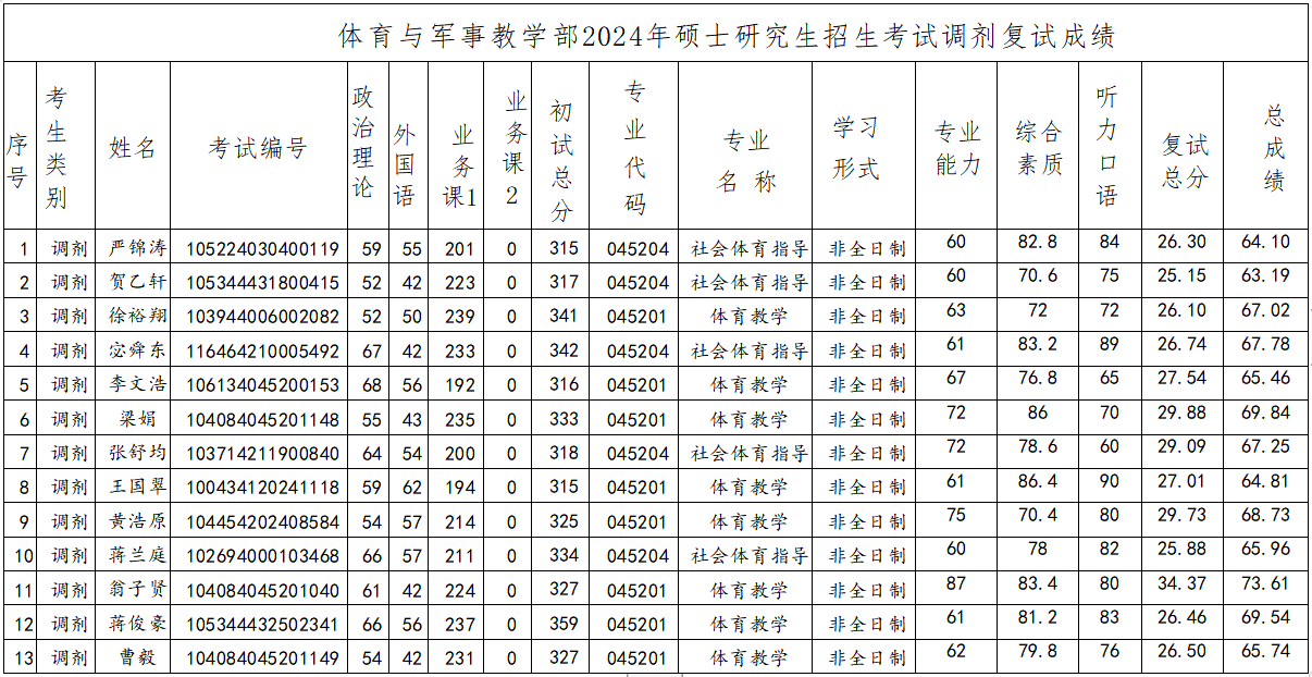 体育与军事教学部2024年硕士研究生招生考试调剂复试成绩公告