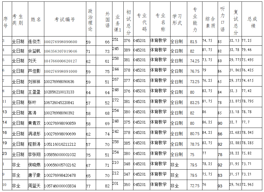 2026年体育学院硕士研究生招生考试(调剂)复试成绩