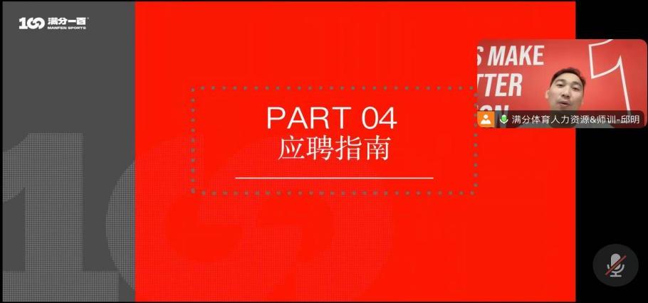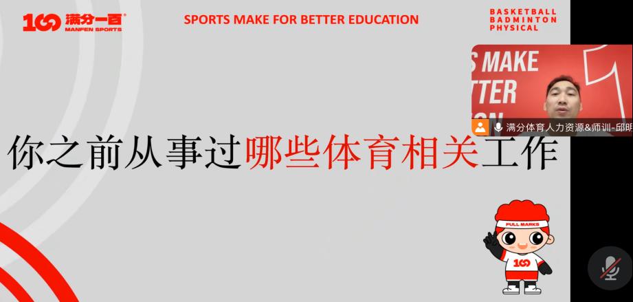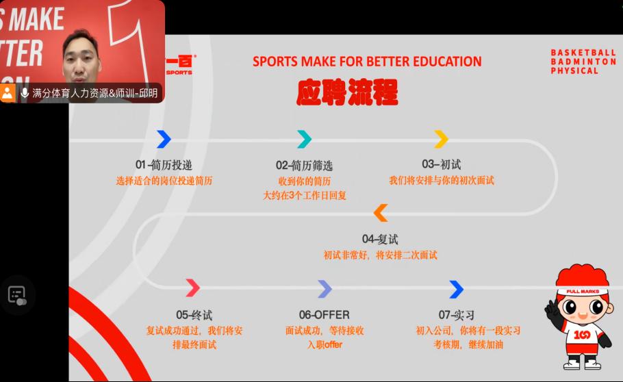 为深入推进2025届毕业生就业工作,搭建更多就业招聘平台,助推2025届毕业生高质量就业。11月15日,体育与军事教学部邀请了宁波满分体育发展有限公司的邱明老师,为2025届毕业生开展线上宣讲招聘会。
