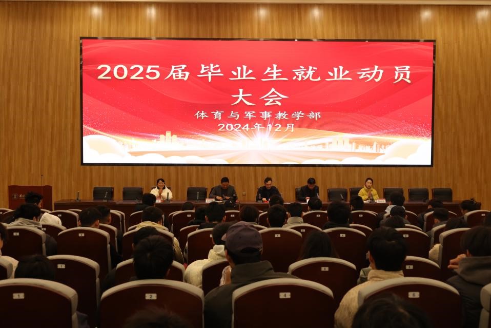 为进一步增强毕业生的就业意识,树立正确的就业观念、认清就业形势、把握就业机会。12月27日,体育与军事教学部在研究生艺术实验大楼报告厅召开2025届毕业生就业动员大会。出席本次会议的有体育与军事教学部党委副书记、主任陈利和,党委副书记李越辉,副主任宋迎东,毕业班班主任周文清,辅导员李娜、彭舟燕,2025届全体毕业班学生,会议由李越辉主持。