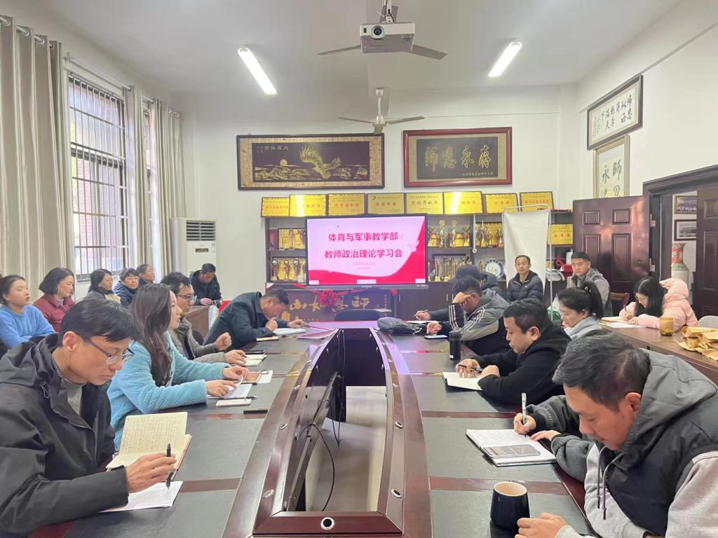 1月10日下午,体育与军事教学部在107会议室召开教师政治理论学习会。传达学习习近平总书记二〇二四年新年贺词等重要讲话精神,并研究部署2024年重点工作,会议由体军部党委书记王晓丽主持,全体教职工参加。