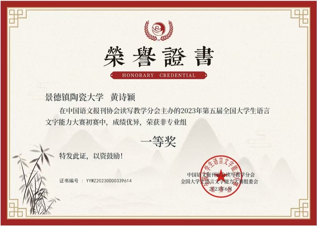她始终牢记一名学生的最基本任务是学习,她按时上课,从未迟到早退,课上认真听讲,积极回答回题:课下认真完成作业,复习课上所讲的内容。这些使她学习成绩一直在专业位列第一,更是连续获得6次一等奖学金。她还积极参与各类竞赛:2022年,她参加全国大学生普通话大赛,并在决赛中获得本科组三等奖;2023年,她参加第五届全国大学生语言文字能力大赛,以非专业组一等奖的佳绩闯入决赛。另外,她在“外教社杯”跨文化能力大赛校赛中取得特等奖,“红五月”英语演讲比赛中获得一等奖、江西省科普讲解大赛校级选拔赛三等奖等的好成绩。如今,她更加明确了自己的目标,也一直在为自己的目标付出行动和努力。学海无涯,所以,在今后的人生道路上,她也依旧不会放松自己的学习。
