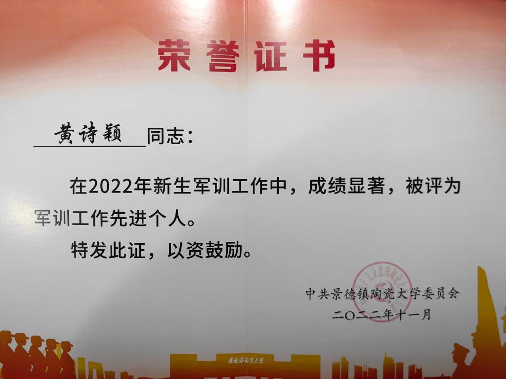 黄诗颖同学作为班级班长兼团支书,积极参加班级和学校内组织的集体活动,她为班级出谋划策,为班级贡献自己的力量。日常,她也是以身作则,带动班级的学风,和同学们一同进步。在2022年的新生军训工作中,她认真负责,最终获“先进个人”称号。这一系列的活动都使她的大学生活丰富而多彩,这一次次经历也让她慢慢成长、蜕变!今后的工作道路上,她也会认真查找并发现自己的不足之处,在锻炼中成长,在成长中锻炼。