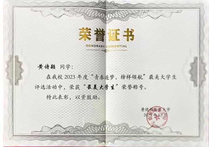 在校期间,她尊敬师长、团结同学、学习认真、上进心强,日常能够很好地与同学们相处,与老师关系融洽。学习成绩十分优异,学习态度端正,连续六学期本专业综合测评排名第一,连续6次获得校一等奖学金,3次获得“三好学生”荣誉称号。工作负责认真,有良好的领导组织及沟通协作能力,连续2次获得“优秀学生干部”荣誉称号,并获得2023年度校级“最美大学生”荣誉称号。