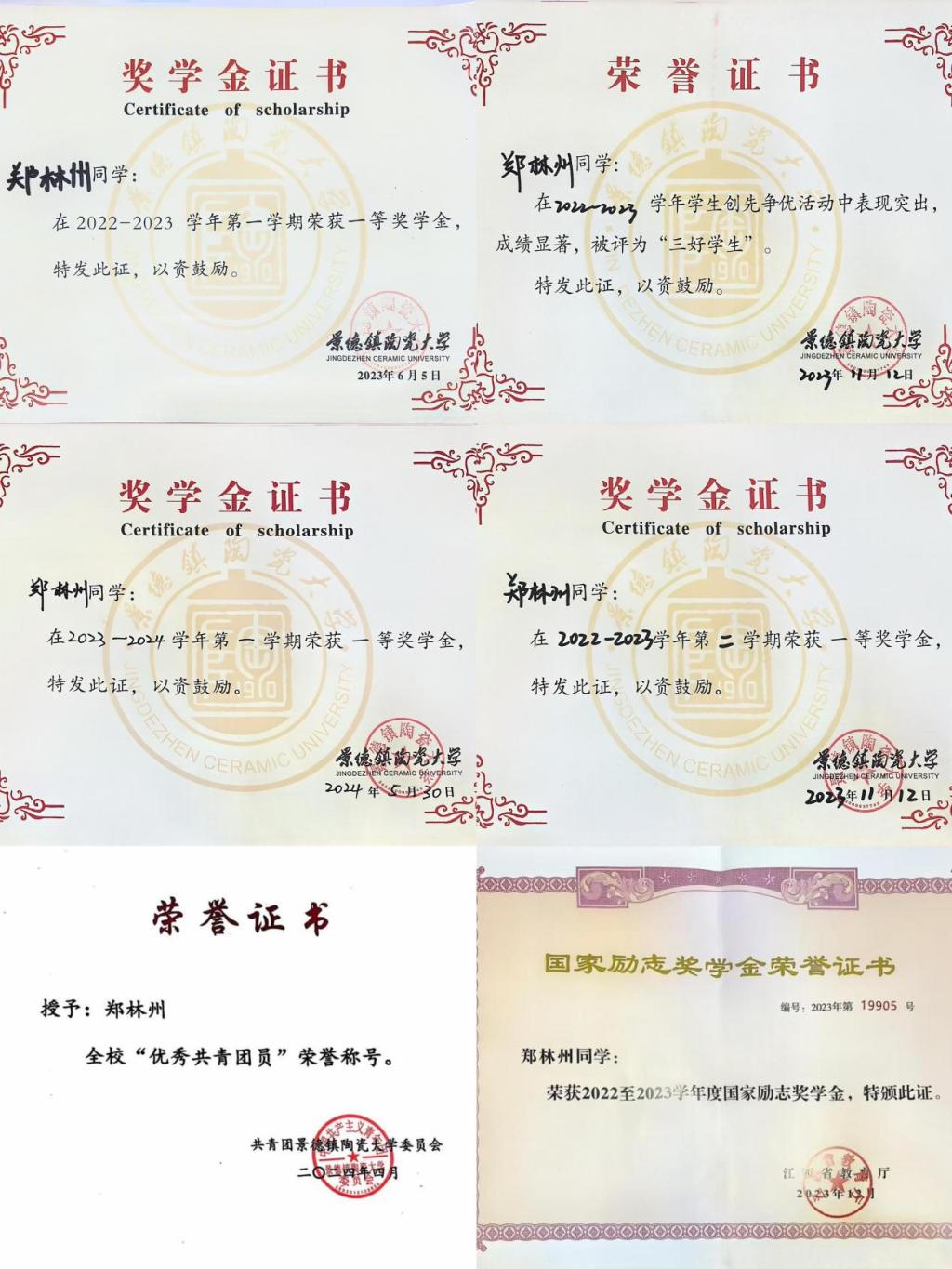 郑林州深知学习的重要性,为了不断提高自己的学习成绩,他按时上课,虚心向老师求解心中的疑惑,课堂上始终要求自己坐在班级前列,积极回答老师的问题。长期的坚持使他的学习成绩多次在班级位列第一,并获得多次校级一等奖学金。除此之外,他还积极参加各类竞赛。在2023年,他考取了篮球二级裁判员和篮球初级教练员证书;同年参加景德镇马拉松比赛,并获得“大众一级选手称号”。